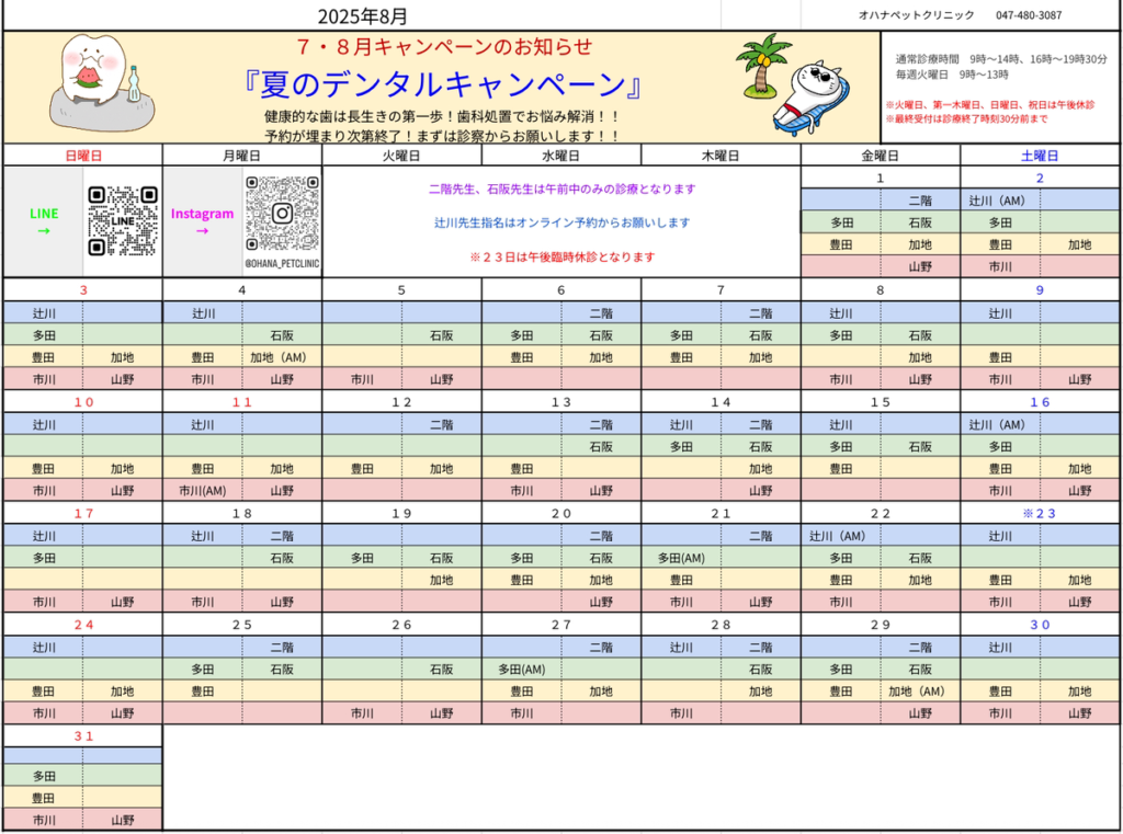 2025年8月4日 / 最終更新日 : 2025年8月4日 オハナペットクリニック お知らせ 8月の診療案内 大変遅くなりました 8月の診療案内をお送り致します 8月は休診日はありません 8/23(土)が午後休診になります ご了承下さい
