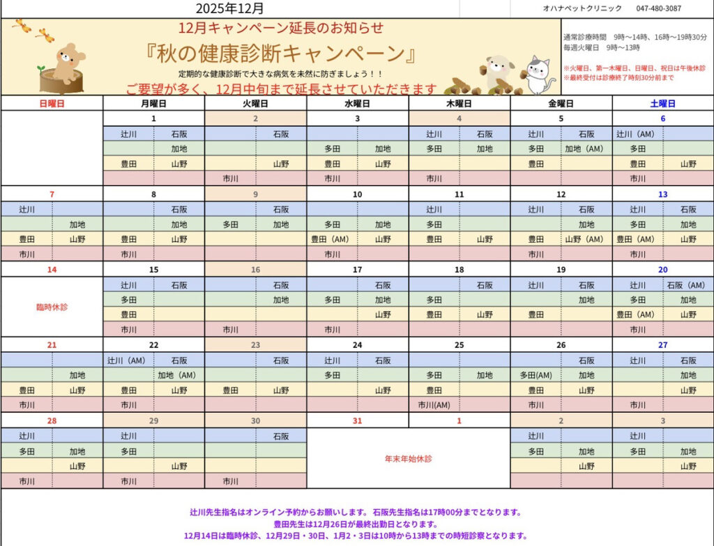 12月と年末年始の休診案内になります