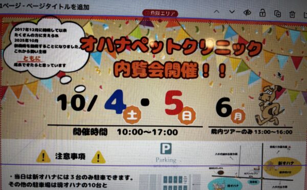 2025年10月8日オハナペットクリニック 内覧会🍀こんにちは😄 朝晩はすっかり秋🍁の気温ですね。日中との気温差が大きいので、飼い主様もペットさん達も体調を崩さないよう、お気をつけ下さい。 さて、 先週の10/4(土)、5(日)に新病院🏥の内覧会を開催いたし […]